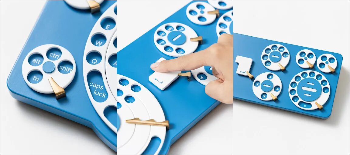 「我々はこれまでのキーボードに足りなかった動作に気づきました。回転です。」とのことで、知っている人には懐かしい、知らない人には新鮮に映るかもしれないダイヤル式のキーボードとなっています。