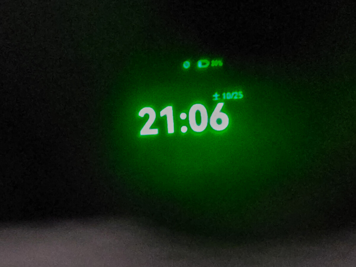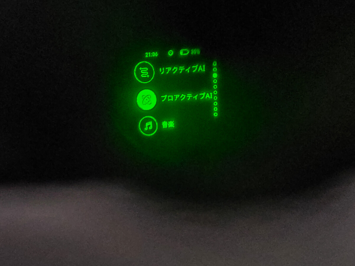 ディスプレイの表示はグリーン1色のシンプルなもの。最近リリースされた、MetaのRay-Ban Displayなどのカラー表示と比べると見劣りするのは間違いありませんが、その分、バッテリー持ちが良く、12時間以上持ちます。