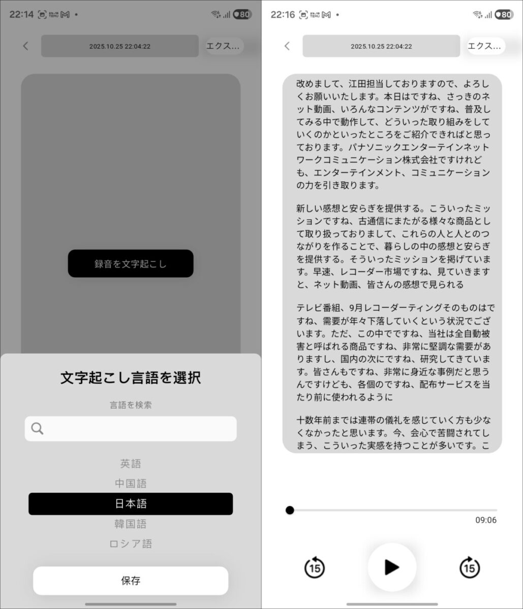 これもそのままの機能です。スマートフォンのレコーダーアプリやAIボイスレコーダーのように利用できます。録音中に重要箇所をタグ付けすることも可能です。この機能自体にディスプレイはほとんど関係ありませんが、録音内容はスマートフォン上で文字起こしが可能です。