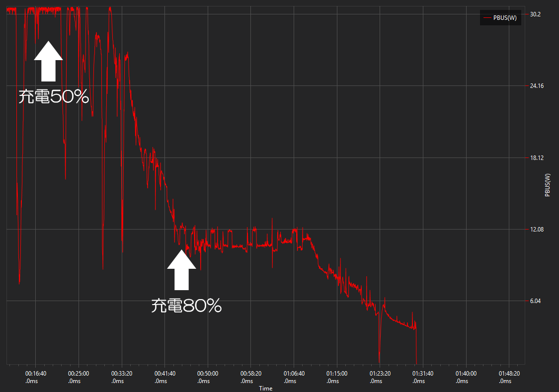 たまに大きく落ち込むことがありますが、40分過ぎ(グラフ上では30分過ぎ)までは、おおむね30Wで充電していました。25Wよりも多いのは、充電器自体の損失や発熱分でしょう。前半に大きく落ち込んでいるのは、ChillBoost冷却テクノロジーによる発熱制御のためかもしれません。