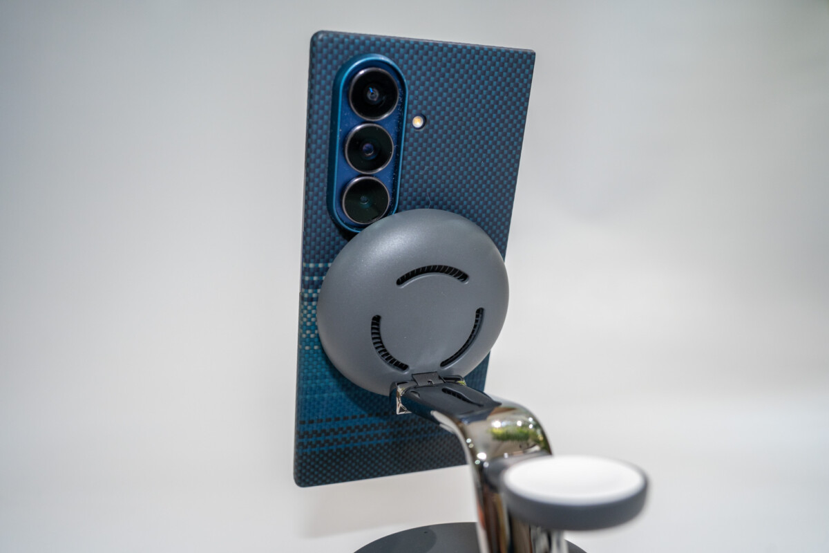 Galaxy Z Fold 7は充電部がカメラに被っているように見えますが、充電面にはエアフローのための段差があるのでギリギリ当たってはいません。