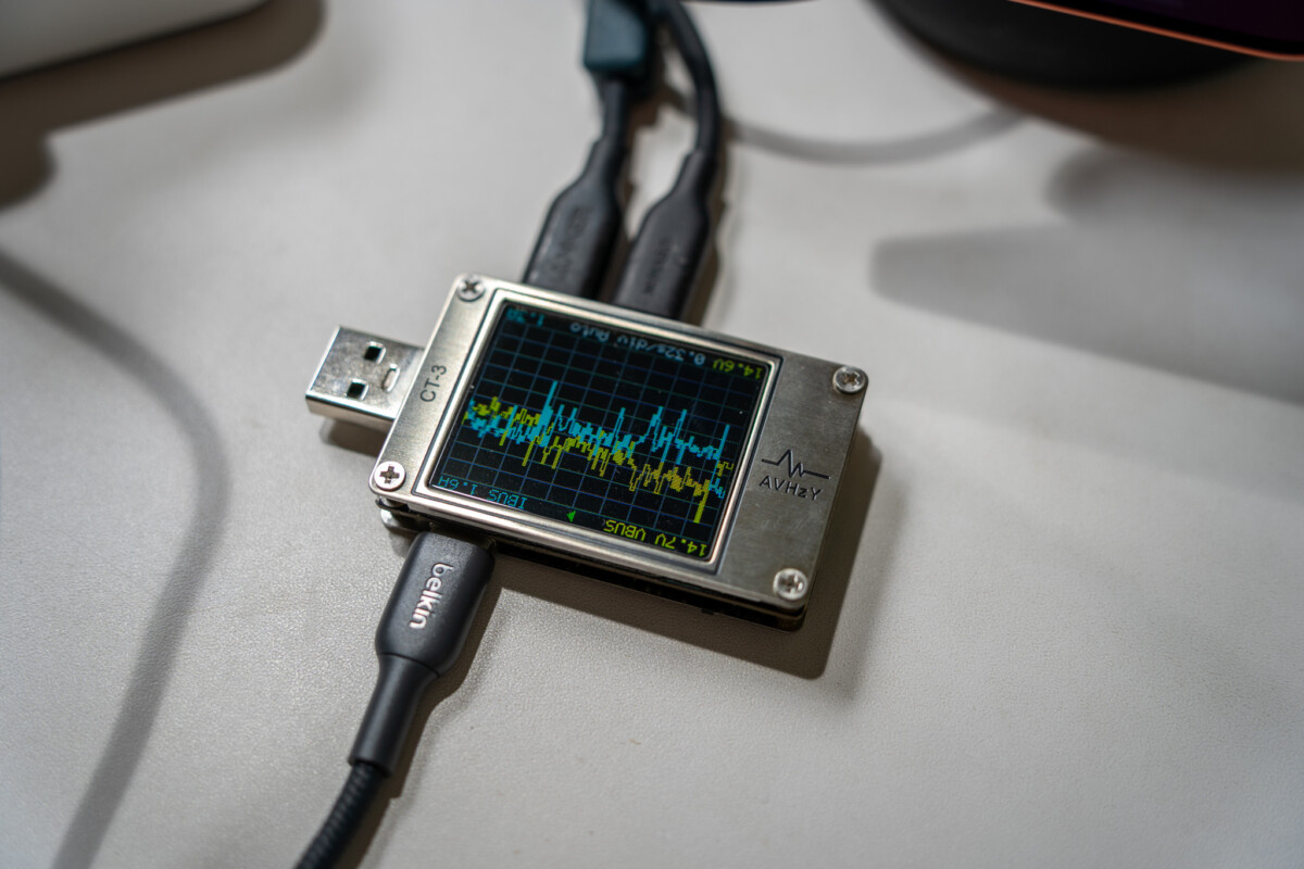 計測の方法は、USBテスター「AVHzY CT-3」に接続して、iPhone 17 Proを充電中のBelkin UltraCharge Pro 3-in-1 Magnetic Charging Dockが消費する電力を計測します。充電器は付属の45W充電器を使用。