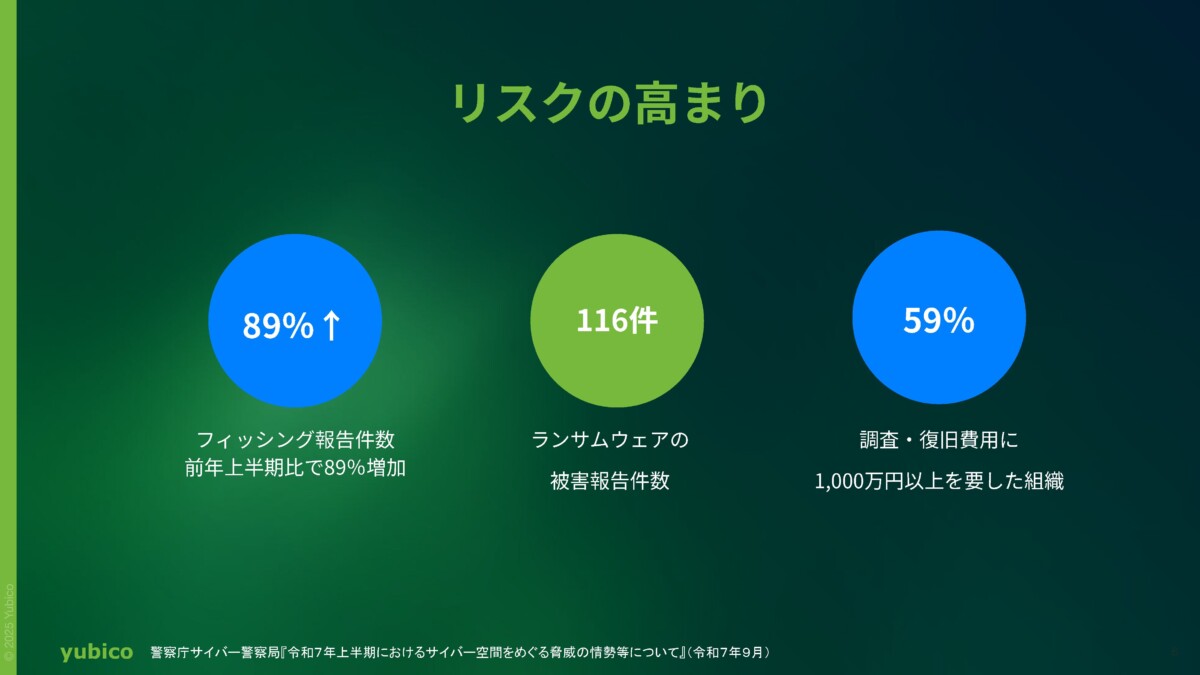 警察庁の統計によると、2025年上半期のフィッシング報告件数は前年同期比89%増加し、ランサムウェアの被害報告は116件に達しました。調査・復旧費用に1000万円以上を要した組織は全体の59%に上ります。