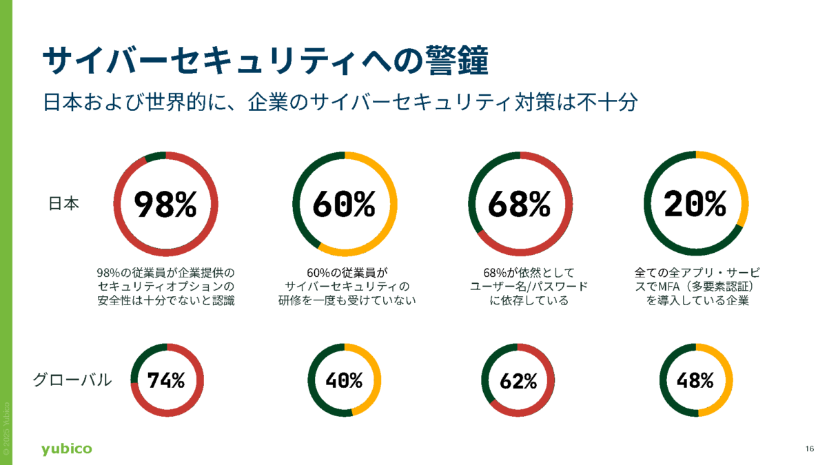 発表会では、Yubicoアジア太平洋日本地域の椎名エバレット戦略営業統括部長が「グローバル認証状況調査2025」の結果を紹介。日本を含む9カ国の働く成人1万8000人を対象とした調査から、企業のサイバーセキュリティ対策の深刻な遅れが明らかになりました。