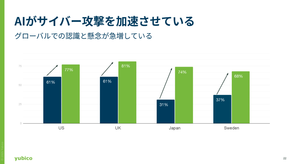 特に深刻なのは、AI技術の進化によるフィッシング攻撃の高度化です。2022年と2025年のフィッシングメールを比較すると、その巧妙さは飛躍的に向上しています。AIによるアカウントセキュリティへの影響を懸念する声は、2024年の31%から2025年には74%へと急増しました。
