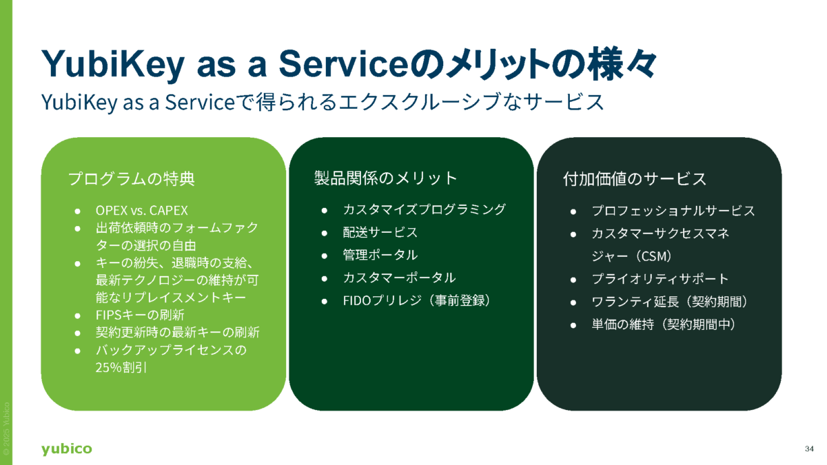 今回発表された「YubiKey as a Service」は、大手企業や政府機関向けに、初期費用を抑えたOPEX(運用費用)ベースでYubiKeyを提供するハードウェア・アズ・ア・サービスです。