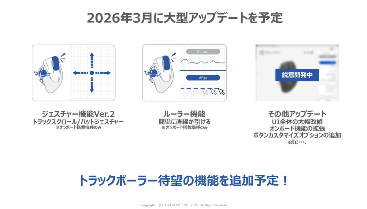 2026年3月に予定されている設定用アプリ「エレコム マウスアシスト」のアップデートにより、トラックボールでスクロールを行える「トラックスクロール」に対応予定とのこと。今のところ、対応機種はHUGE PLUSとIST PROのみとなっています。
