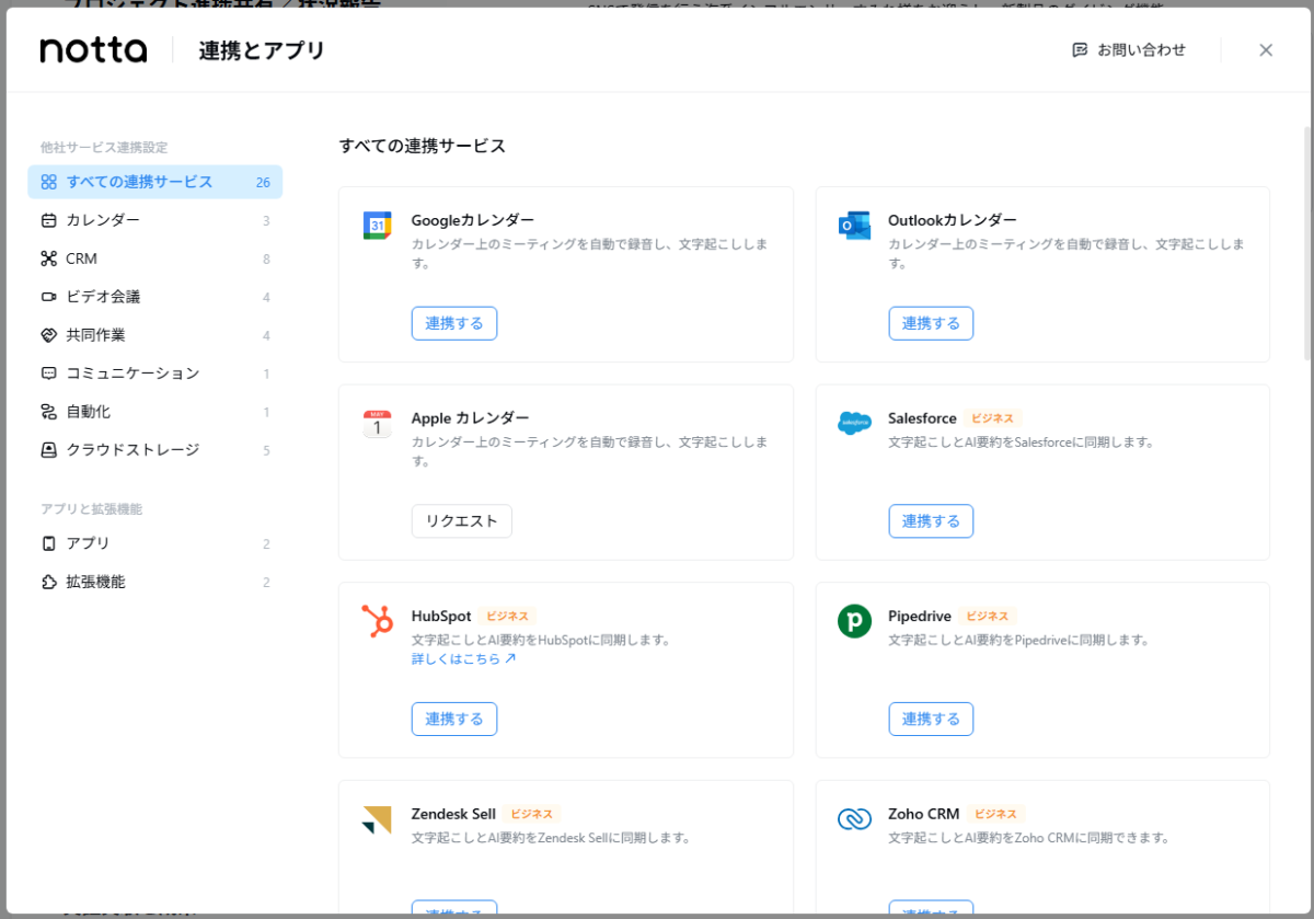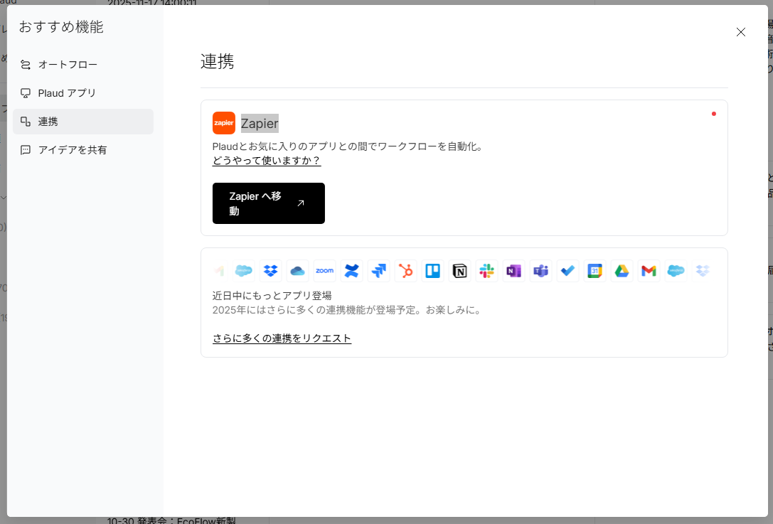Plaudも連携機能はあるものの、現在利用できるのはZapierのみ。この点ではnottaに及びません。