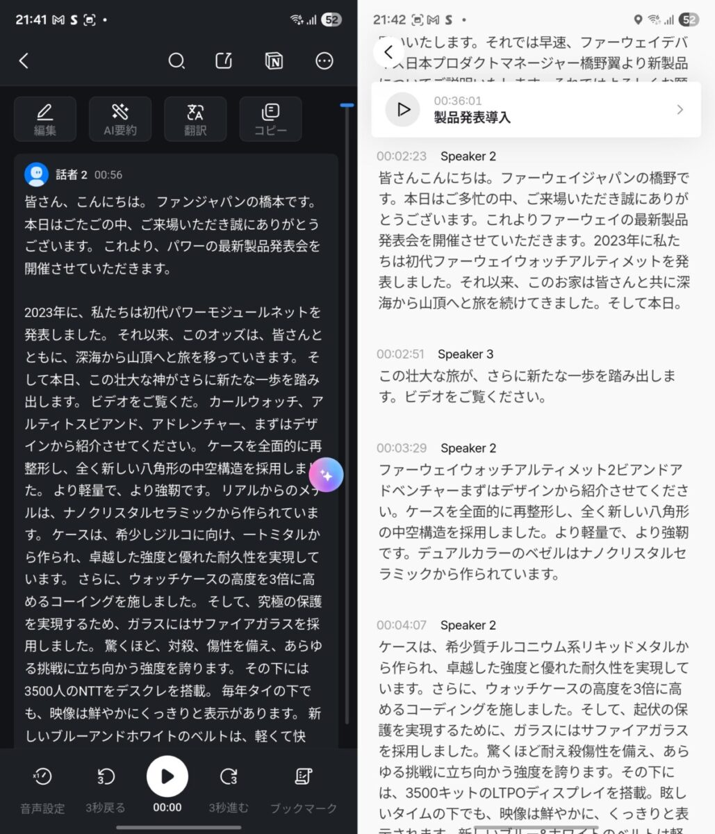 肝心の文字起こしの精度ですが、固有名詞などは細かな手直しは必要ですが、実用上は問題ないレベルです。固有名詞も良く利用するものであれば、単語登録しておくことで正確に文字起こしを行えます。話者認識も正確で、この点はPlaudよりも優れている印象でした。