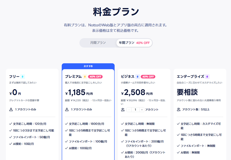 なお、プレミアムプランでは1800分/月、ビジネスプランでは無制限で文字起こしが可能です。
