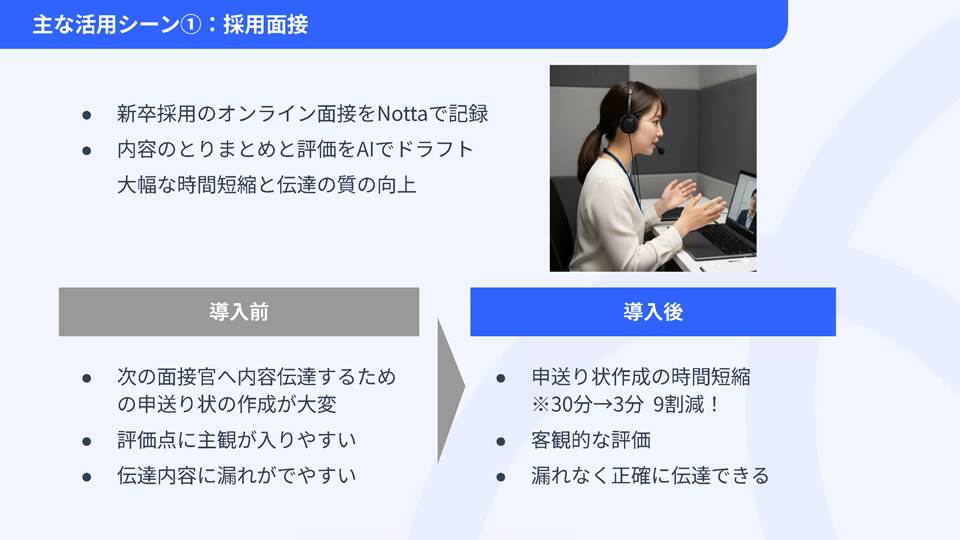 先日、Nottaの活用に関するラウンドテーブルがあったのですが、建設・不動産業界のオープンハウス・アーキテクト社では、採用面接にNottaを活用しているという話もありました。