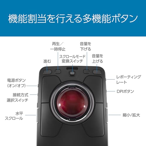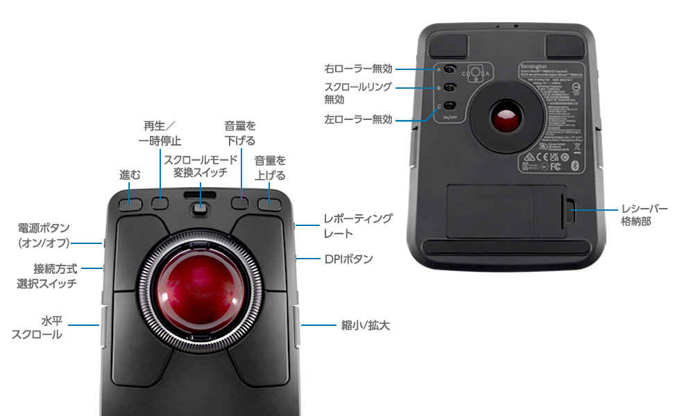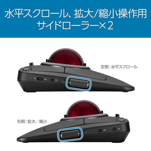 Kensingtonの人気トラックボール、エキスパートマウスの最新モデルで、55mmの大玉を採用。トラックボール外周に配置されているスクロールリングに加えて、両サイドにスクロールローラーを備えます。片方を水平スクロール、もう片方は拡大・縮小に割り当てられていますが、コンパニオンアプリからカスタマイズが可能です。