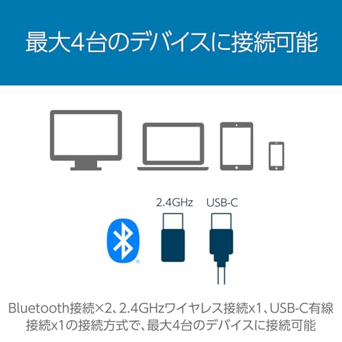 接続は、2.4GHz無線、Bluetooth LE×2、USB有線に対応しており、最大4台のデバイスに接続可能です。