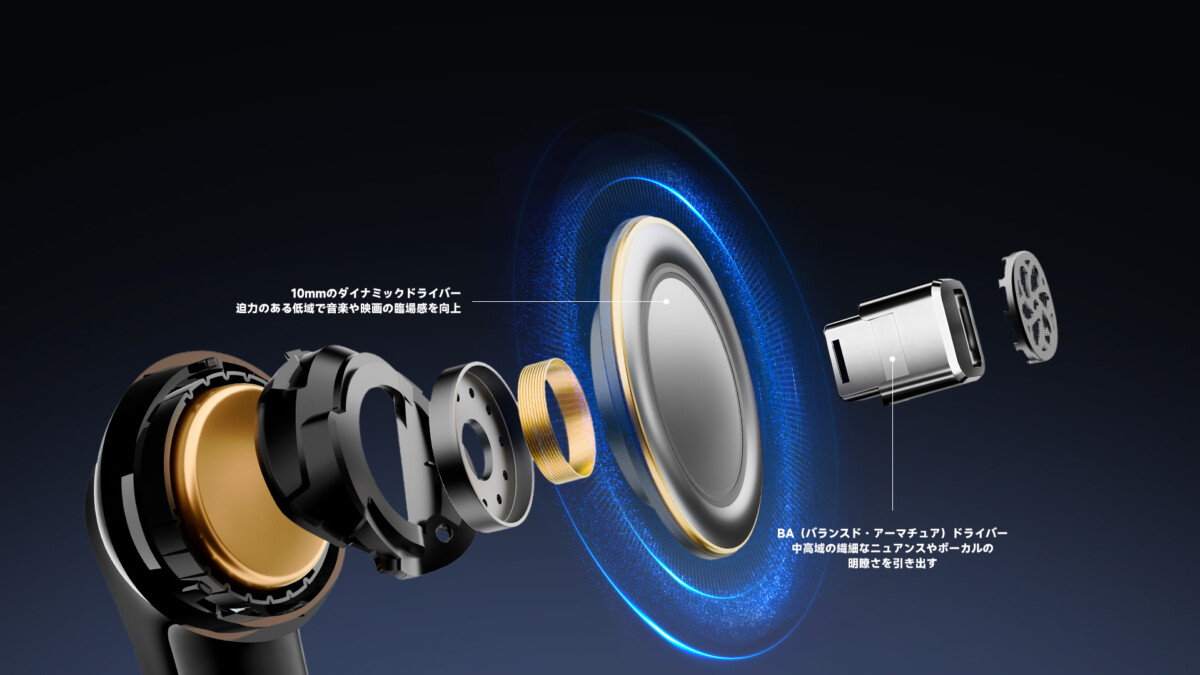 Air Pro 4+の最大の特徴は、10mmダイナミックドライバー(DD)と、自社開発の業界最小クラスBAドライバーを組み合わせたハイブリッド構造を採用した点にあります。