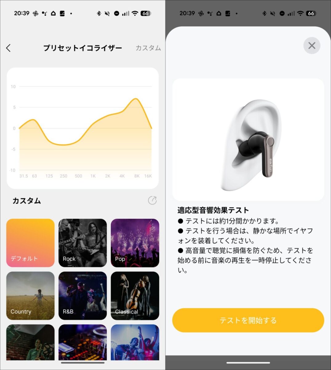 実際に音楽を聴いてみると、低音の迫力と中高音のクリアさが共存しており、従来モデルよりも音のまとまりが良く感じられます。アプリには豊富なプリセットのほか、聴こえ方に合わせて最適化する適応型イコライザも用意されており、調整幅の広さはEarFunらしいところです。