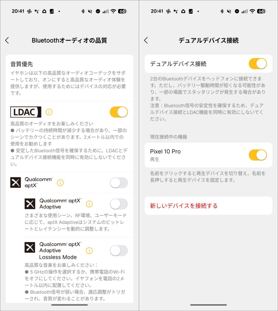 また、EarFunデバイスでは初めて、LDACを有効にした状態でもマルチポイント接続が利用できるようになっています。ただし、アプリ上では併用は推奨しないということにはなっています。LDACが利用できるデバイスも限られているので、あまりマルチポイント接続の需要はないかもしれませんが、ひとまず出来るようになったのは歓迎したいところです。