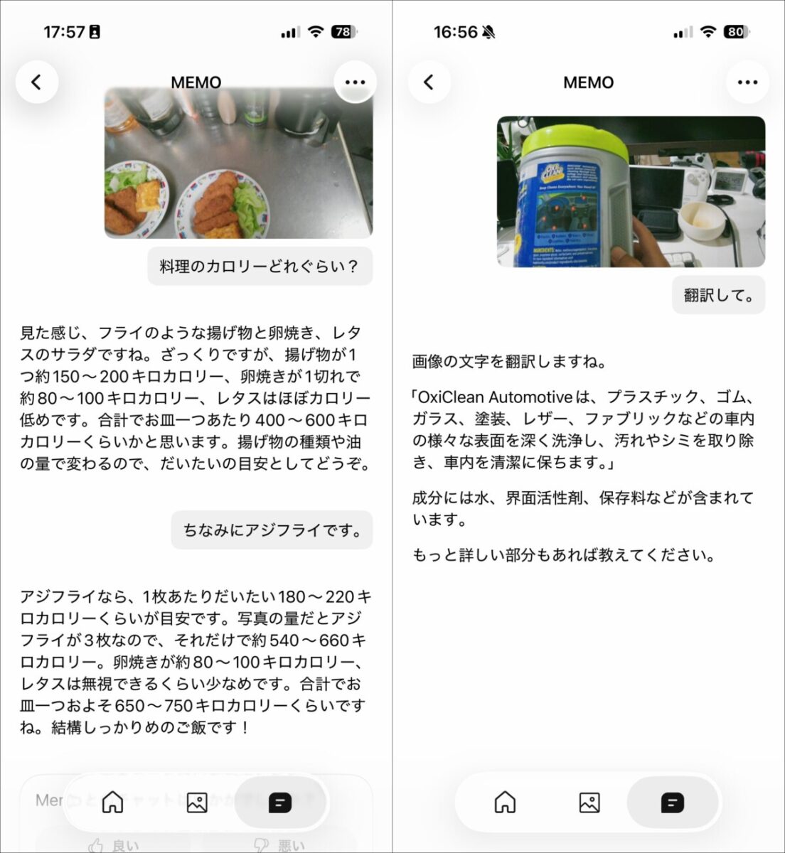 キャプチャボタンを押さなくても、AIアシスタントのMemoを起動し「写真を撮って」と指示するだけで撮影が可能です。両手で何かを持っているシーンを撮影したい場合などにはこちらが便利です。