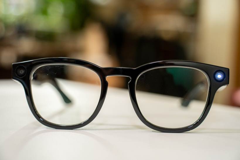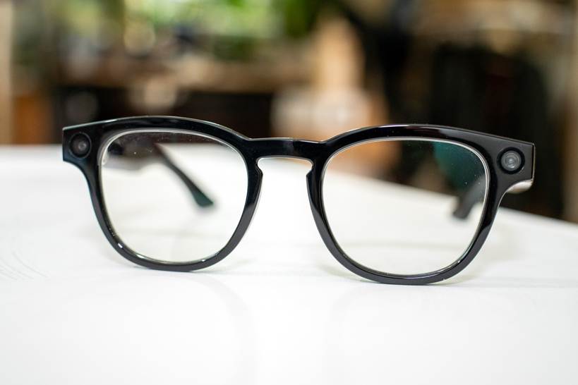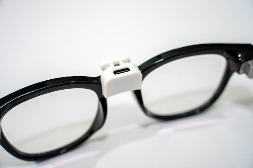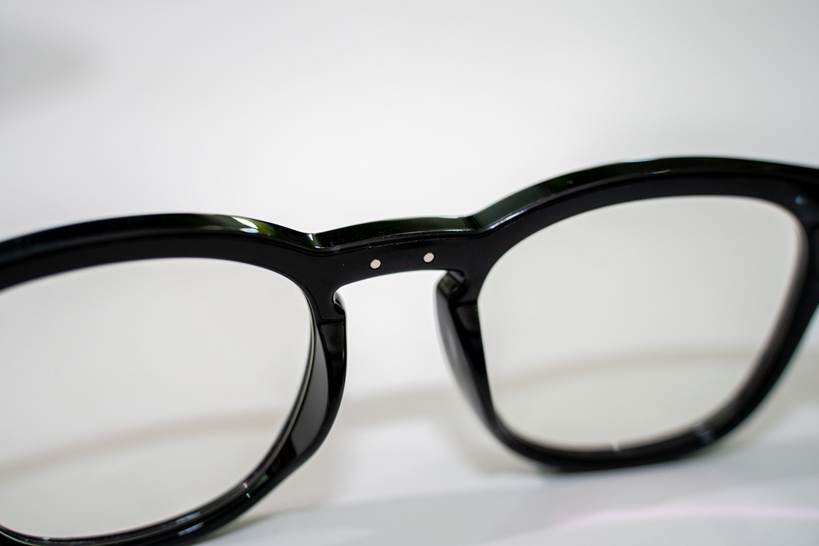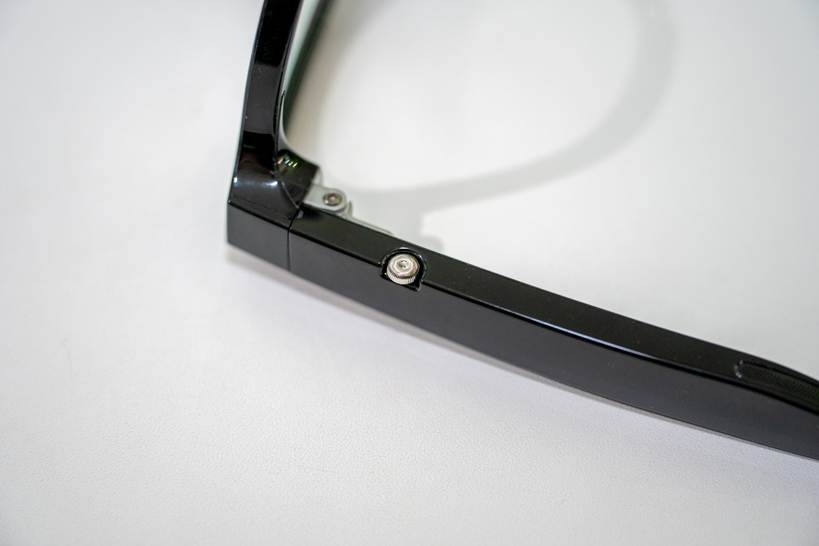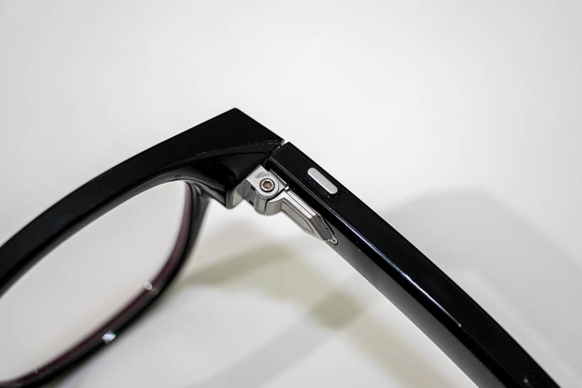 今回試したのは、艶黒タイプ。ぱっと見では、テンプル(ツル)が太めの普通のメガネという感じですが、フロントの右側(メガネのパーツでは智と呼ばれる部分)にカメラを搭載しているのが、外観での大きな特徴です。