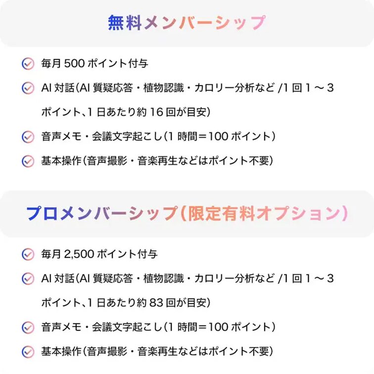 ただ、AI操作でも、オフラインで完結する操作(音声での撮影や音楽再生の操作など)にはポイントは消費しません。つまり、スマートグラス単体で完結する操作にはポイントを消費せず、クラウド処理が必要になる場合にはポイントを消費するという形です。ポイントが足りなくなった場合には、月額2900円のプロメンバーシップに加入すると、2500ポイントが付与されます。