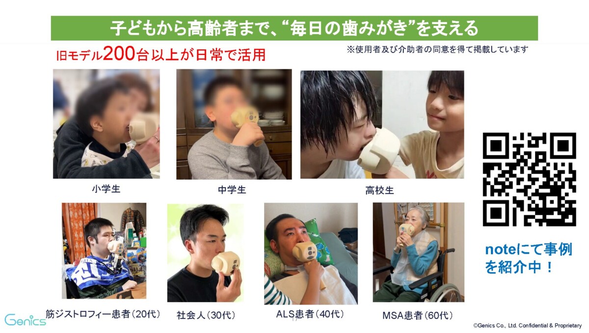Genics代表の栄田氏は、2015年の早稲田大学大学院在籍時からこの研究を開始しました 。これまでに3Dプリンターで製作された200台以上のプロトタイプが、実際の介護現場や家庭でテストされ、フィードバックが蓄積されてきました。