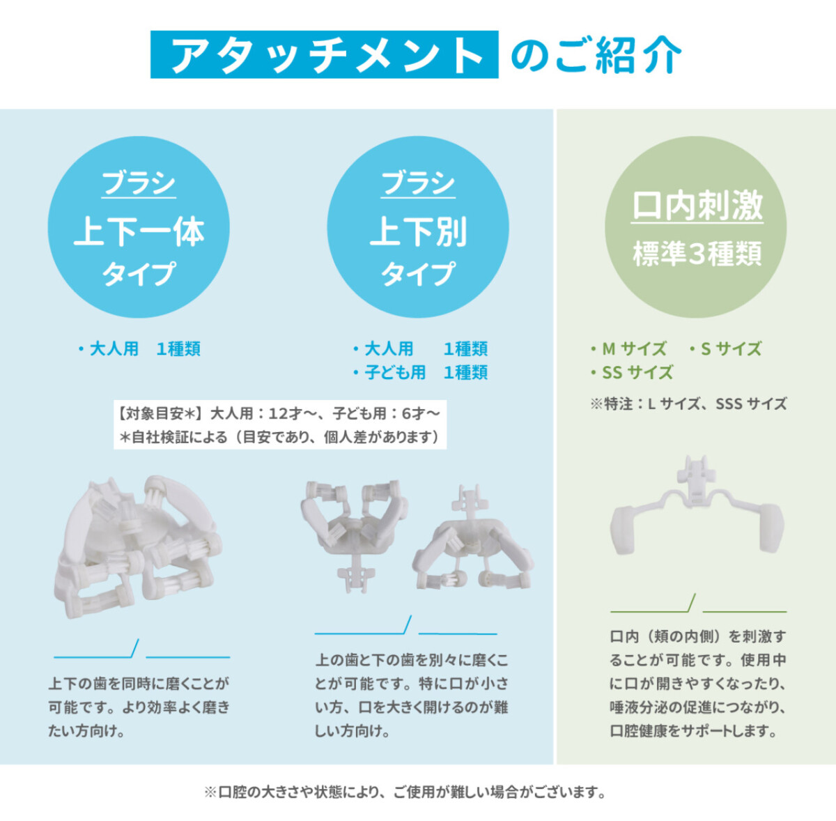 ブラシパーツは、上下一体ブラシ(大人用1種類)、上下別ブラシ(大人用1種類、子ども用1種類)、マッサージパーツ(SS、S、Mの3種類)が用意されており、使用者の年齢や目的に応じて選択できます。