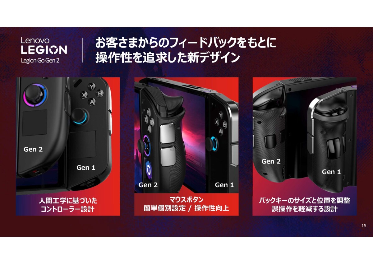 従来の角ばったデザインから、人間工学に基づいたデザインに変更され、全体的に丸みを帯びた印象に。また、右側側面にあったマウスボタンは従来ショルダーボタンと一体化していたものを個別化。背面のバックキーはあえて大きくしていたとのことですが、誤操作するというフィードバックがありサイズと位置が変更されました。
