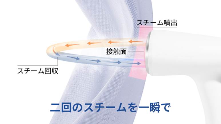 これにより、一度で「噴出」と「回収」の往復2回、スチームを衣類に当てることが可能になっています。スチームを無駄に逃さず循環させることで、しわを短時間で効率的に伸ばすことができるようになっています。
