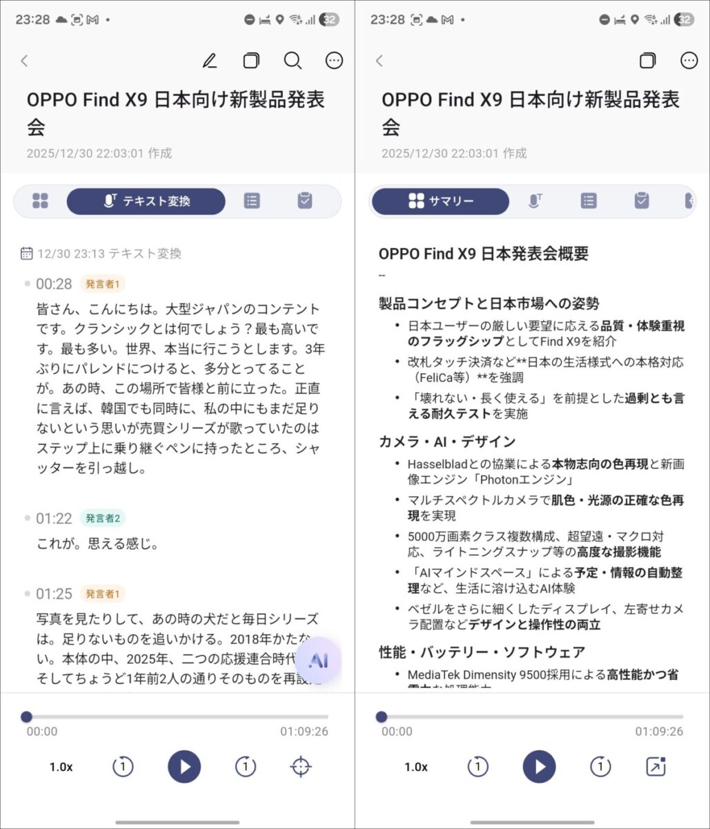 1回に記録できるのは4時間まで。録音したデータは、スマートフォンに同期され、スマートフォンのアプリから文字起こしが可能。同時に要約なども行われます。