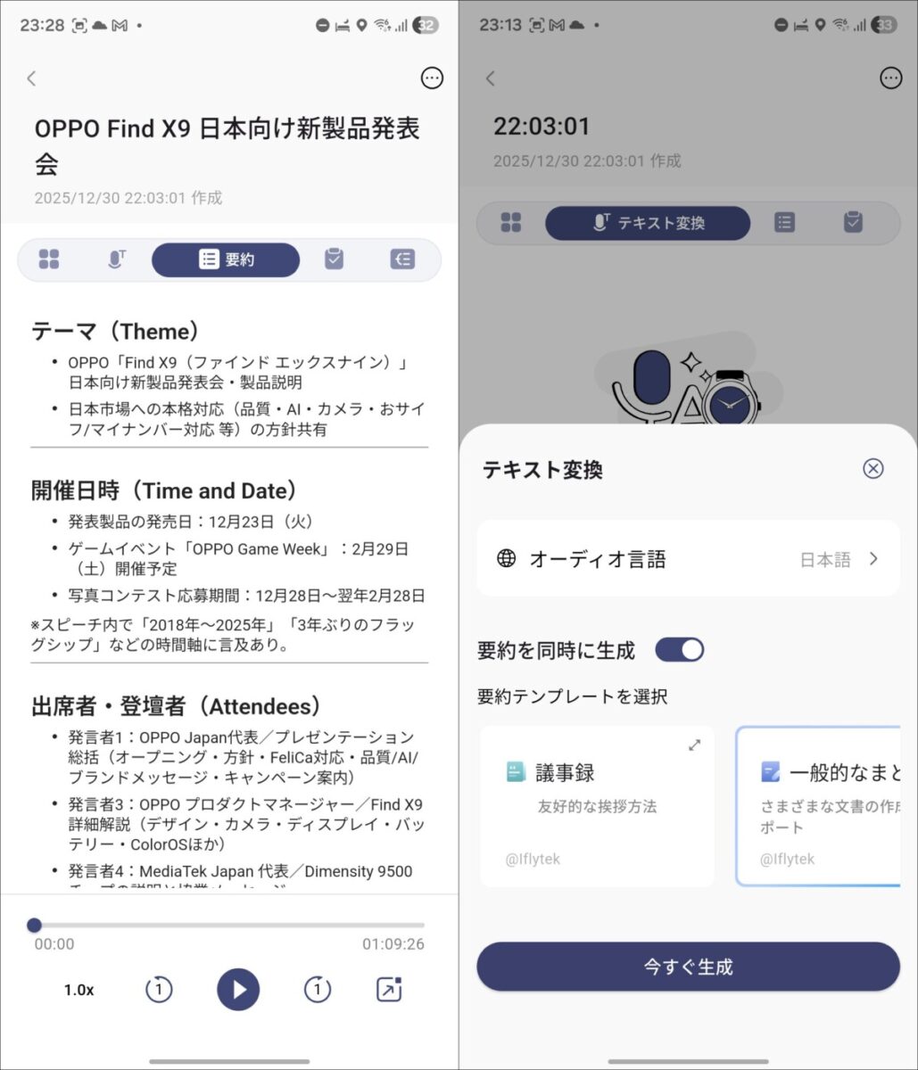 また、要約とは別に、サマリーも生成されます。項目名的には何が違うのかと感じますが、サマリーは文字起こしの内容を時系列に沿って簡潔にまとめた内容、要約のほうは全体を通しでより詳細にまとめたものという感じです。要約に関しては、いくつかのテンプレートから形式を選択可能です。