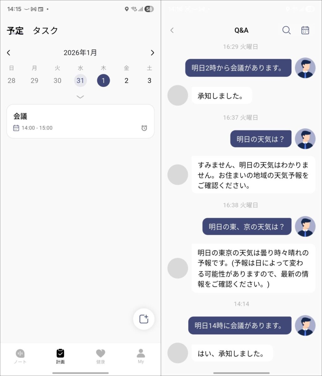 質問するだけではなく、ToDoやスケジュールへの追加も可能。例えば、「明日14時から会議があります」と話すと、スケジュールに追加されます。