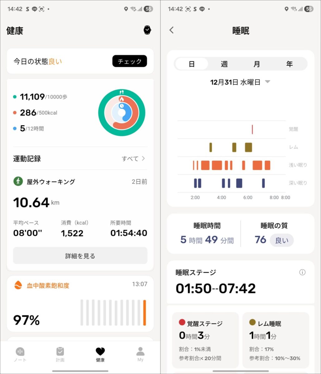 ヘルスケア・アクティビティ関連の機能としては、心拍数やHRV(心拍変動)、血中酸素飽和度(SpO2)、睡眠記録、運動記録に対応しています。