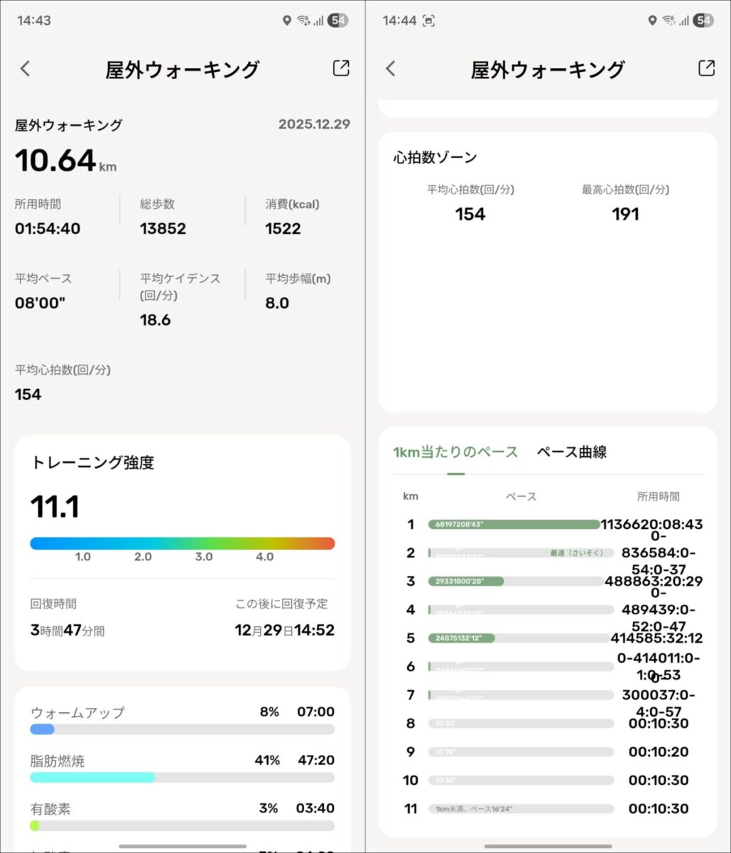 睡眠記録や平常時の心拍数などについては、とくに問題はないのですが、運動時の心拍数がかなり高めに計測されるという点が気になりました。同時に装着していた他のスマートウォッチやスマートリングでは100回/分以下の場合でも、AIWATCHでは180回/分以上となりました。
