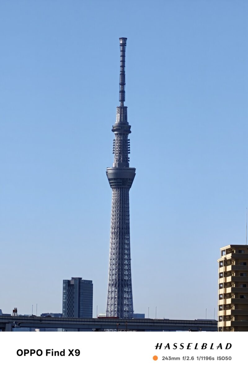 望遠はデジタルズームで最大120倍に対応。通常、高倍率のデジタルズームは画質が荒く実用性に欠けることが多いのですが、Find X9はAI処理により画質を補完しており(おそらく)、120倍でも被写体の視認性は十分。10倍(243mm相当)辺りまでなら、実用的に使えそうです。