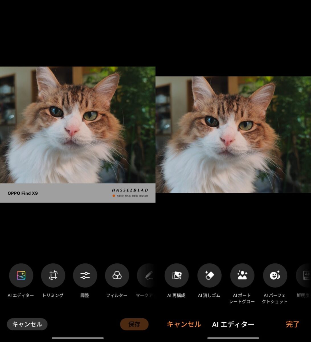 なお、AI関連の編集機能も利用可能。「AI再構成」「AI消しゴム」「AIポートレートグロー」「AIパーフェクトショット」「鮮明度強化」「ぼけ除去」「反射除去」が選択できます。