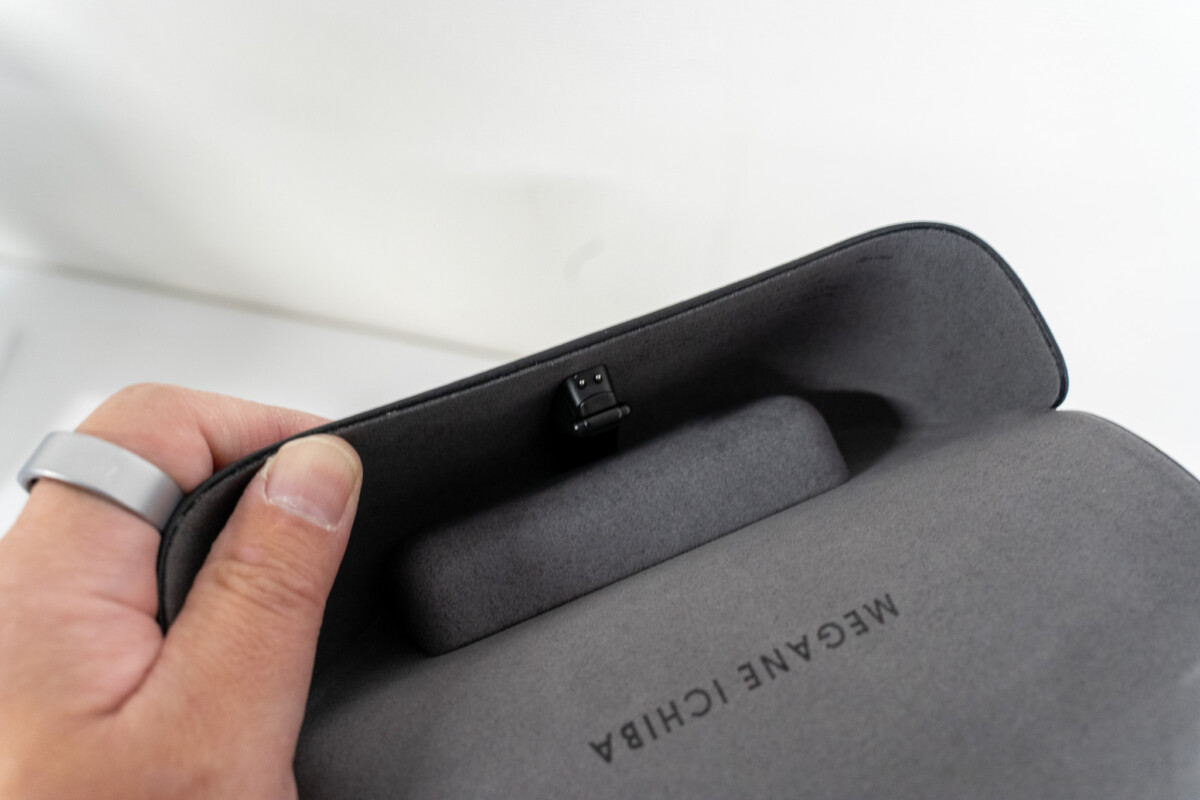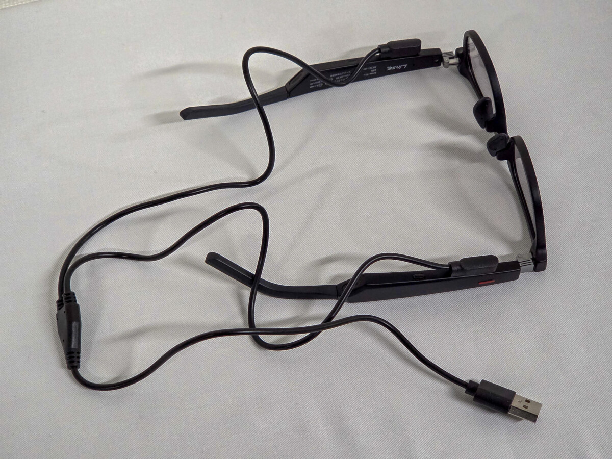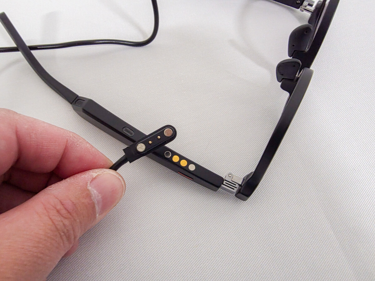 こちらの充電は、専用の二股ケーブルを使用。テンプルの底面に端子があり、ここにマグネットの充電ケーブルを接続します。