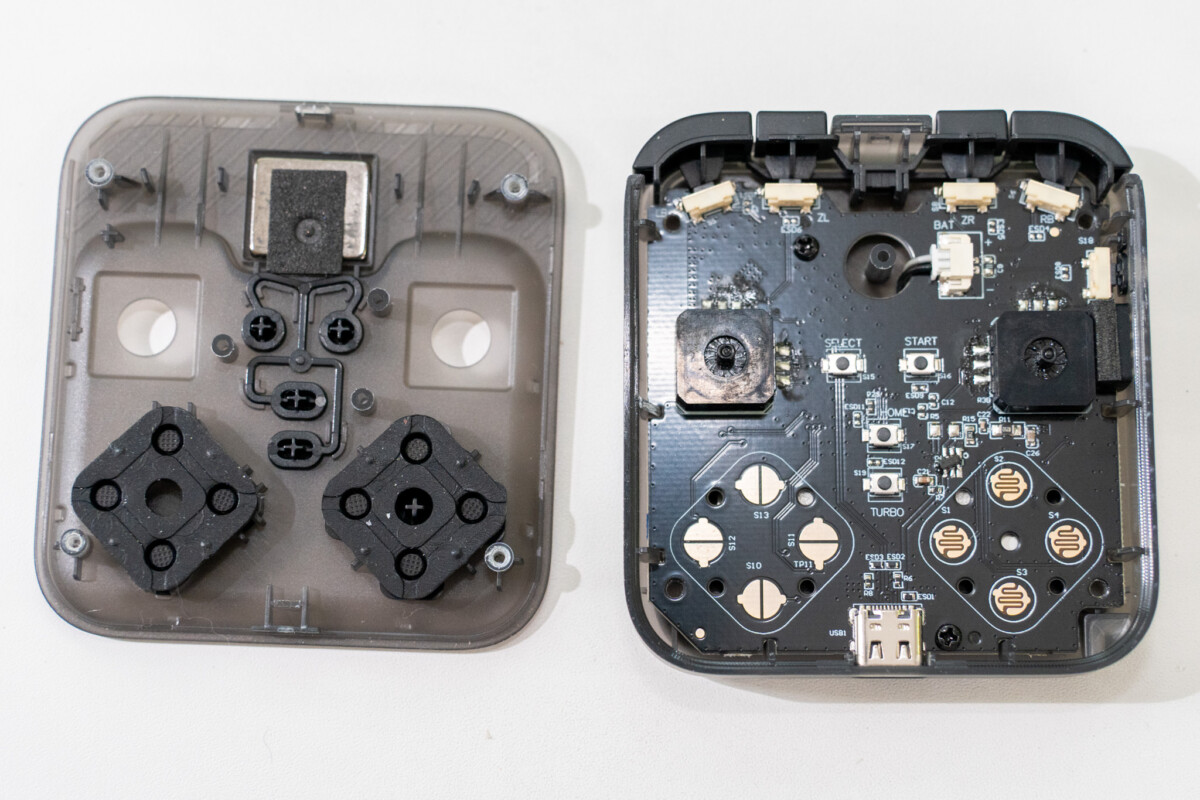 「L/ZL/R/ZR」「+/ー」「M」「ホーム」はカチカチとしたタクトスイッチ。十字キーとABXYはラバースイッチです。