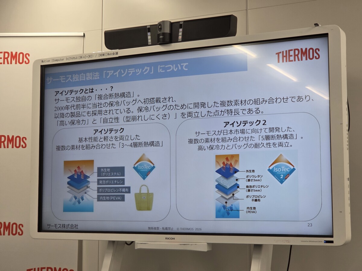 今回の保冷バッグ製品には、サーモス独自の複合断熱構造「アイソテック」シリーズが採用されています。