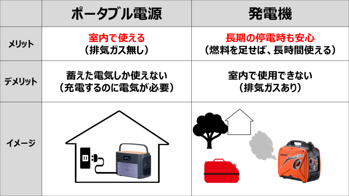 従来、ポータブル電源は室内で安全に使える一方で、蓄えた電気を使い切ると停電時には充電できないという弱点がありました。逆に発電機はガソリンさえあれば長時間使えますが、排気ガスが出るため室内では使用できません。