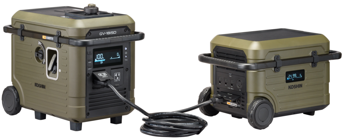 工進のハイブリッド蓄電システムは、屋外に設置したインバーター発電機(GV-18iSD)と室内のポータブル電源(BPS-24LD)を接続することで、この両者の弱点を解消しています。ポータブル電源の残量が少なくなると自動で発電機が起動して充電を開始するため、手動での操作は不要です。