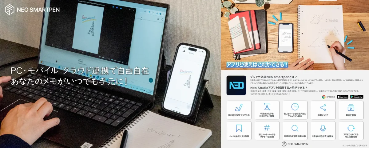 専用アプリ「Neo Studio 2」はモバイル版に加え、Webブラウザ版(https://neostudio2.io)も提供されており、PCからもアクセス可能。デバイスを問わず手書き記録の閲覧・編集が可能です。