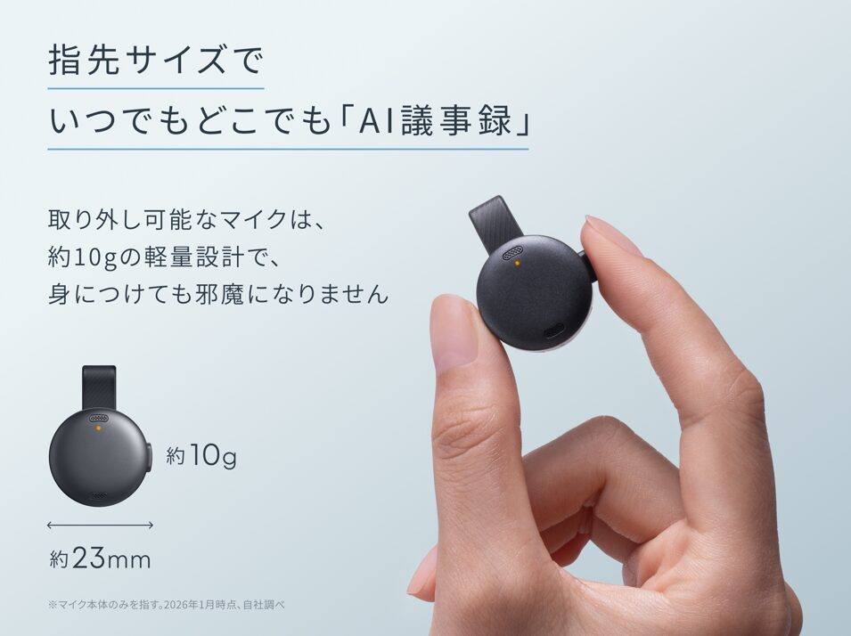 ハードウェアとしては、指先ほどのサイズでありながら最大5m先の音声まで捉える収音性能を持ち、マイク単体で最大8時間、充電ケース併用で最大32時間の連続録音が可能です。