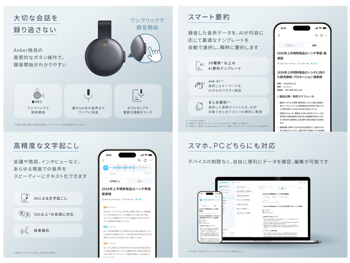 AnkerのオーディオブランドSoundcoreから、同社初となるAIボイスレコーダー「Soundcore Work」が発表されました。2月18日より予約販売が開始されます。価格は2万4990円(税込)。発売自体は3月3日。3月2日までは予約期間の特別価格として30%オフの1万7499円となっています。