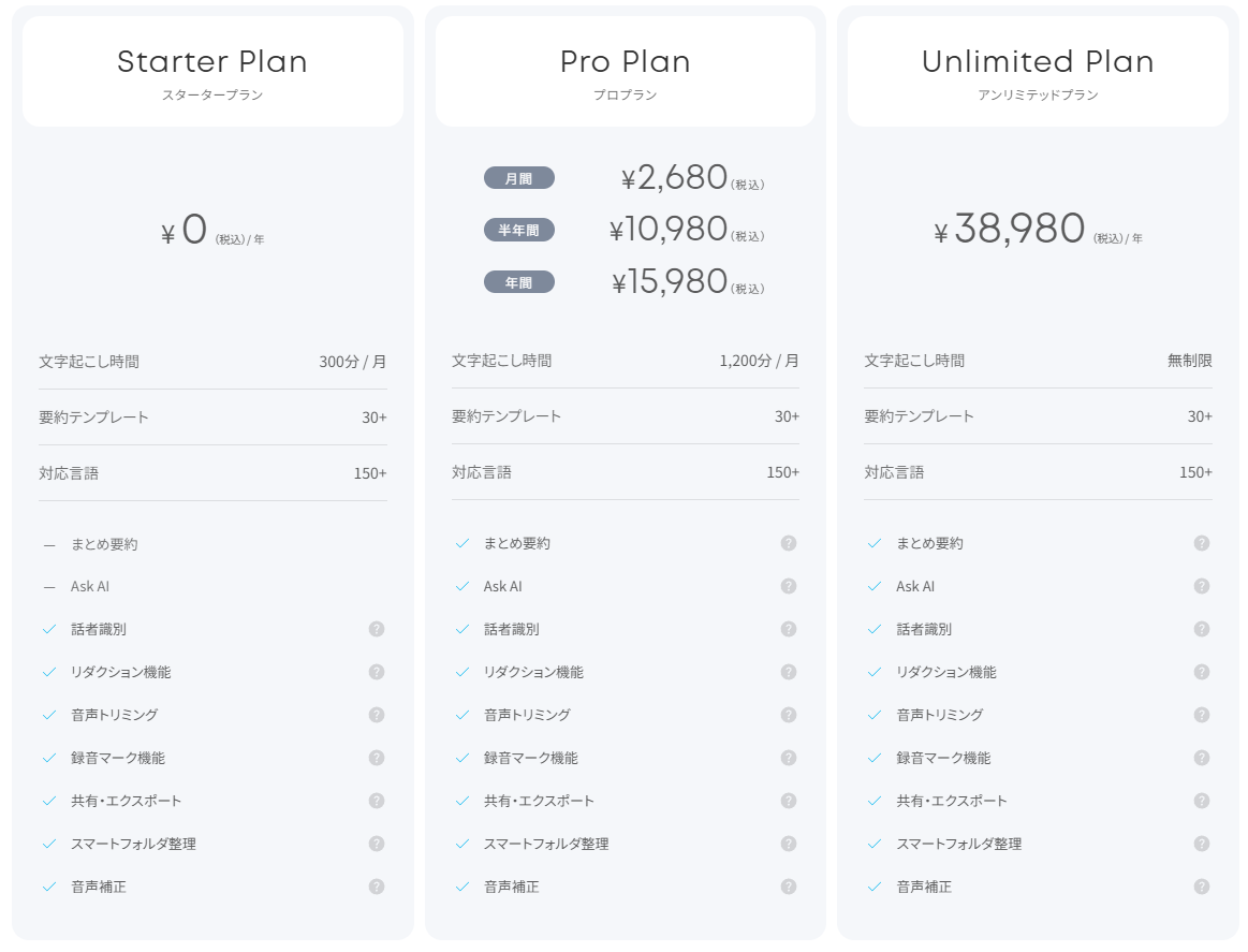 無料プランでは月300分まで文字起こしが可能。月額2680円のProプランでは1200分/月、年額3万8980円のUnlimitedプランは無制限。また、単に文字起こしの時間だけを追加したい場合には、120分480円から追加が可能です。