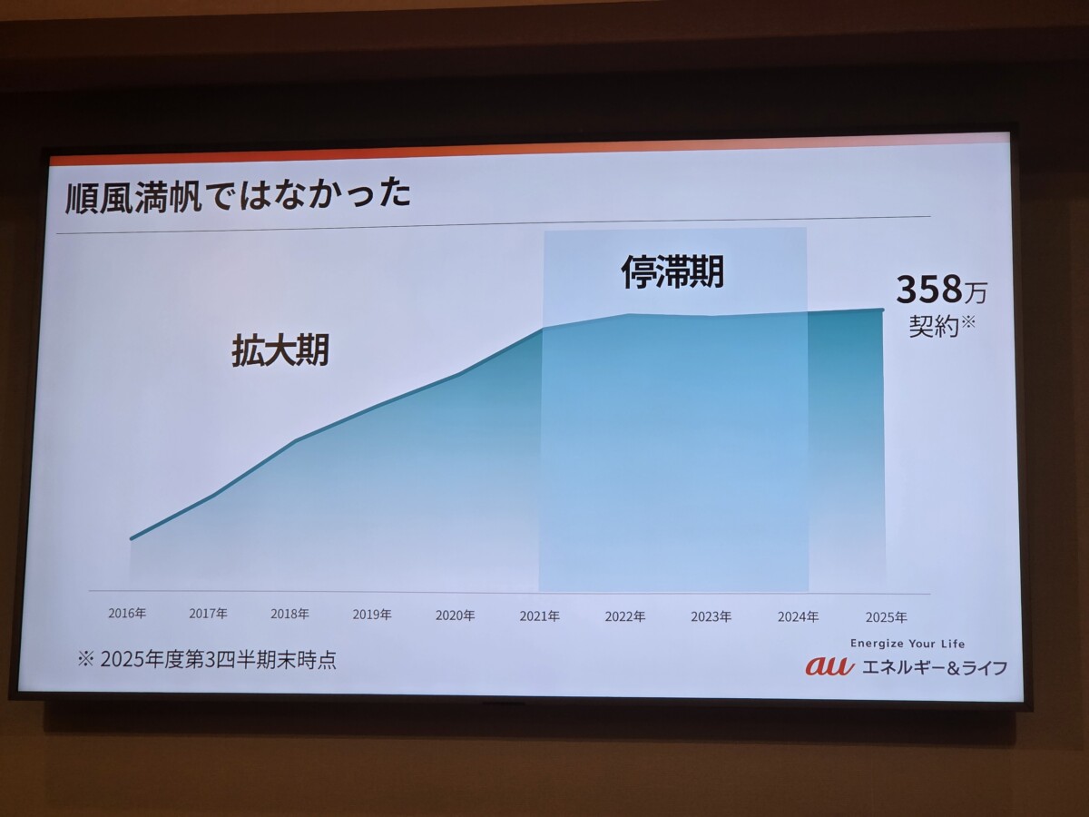 契約数は開始当初から順調に伸びていましたが、2021年度の燃料費高騰を機に停滞期へ。この時期には新電力事業者が相次いで倒産するなど、業界全体が激震に見舞われました。しかしauでんきはその逆境を乗り越え、現在は「再拡大期」に突入。2024年12月時点で358万契約を達成したとのこと。アプリのダウンロード数は400万、1年以上の継続利用率は92.1%と、高い定着率を誇っています。