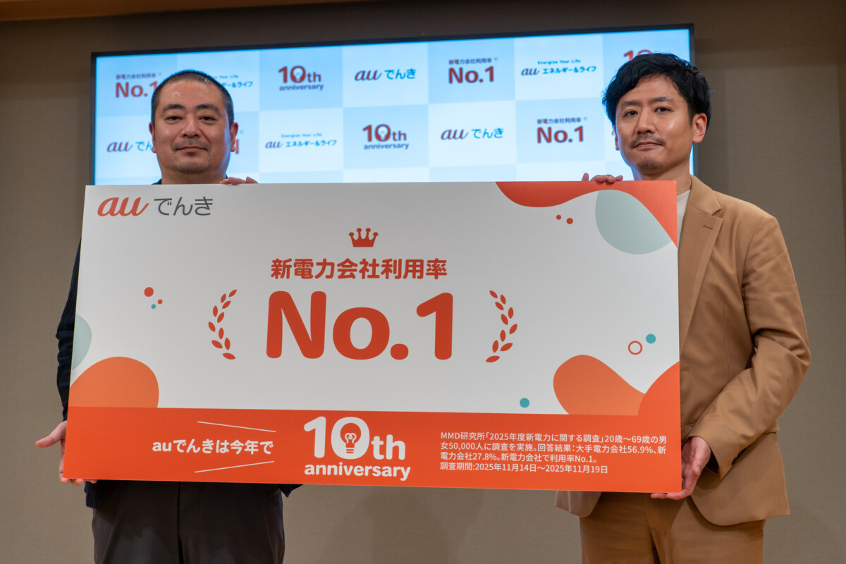 auエネルギー&ライフは2025年2月26日、「新電力ナンバーワン評価の背景と実態に関する発表・座談会──auでんき10周年を迎えて」を開催しました。MMD研究所の調査で、利用している新電力会社で1位を獲得したことを受けてのもので、同社取締役副社長の吉岡尉登氏による事業解説、MMD研究所所長の吉本浩司氏による調査データの解説、実際のユーザーを招いた座談会という3部構成で行われました。
