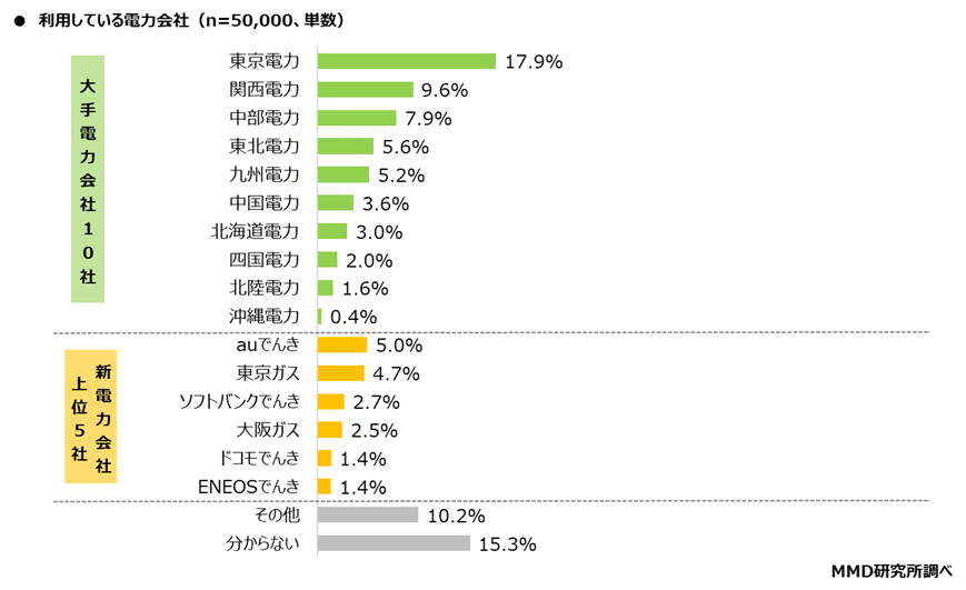 今回の発表の根拠となったのが、MMD研究所が実施した「2025年新電力に関する調査」です。20歳〜69歳の男女50,000人を対象にした予備調査において、新電力の中でauでんきはシェア5.0%を獲得し、東京ガス(4.7%)、ソフトバンクでんき(2.7%)を抑えてトップに立ちました。