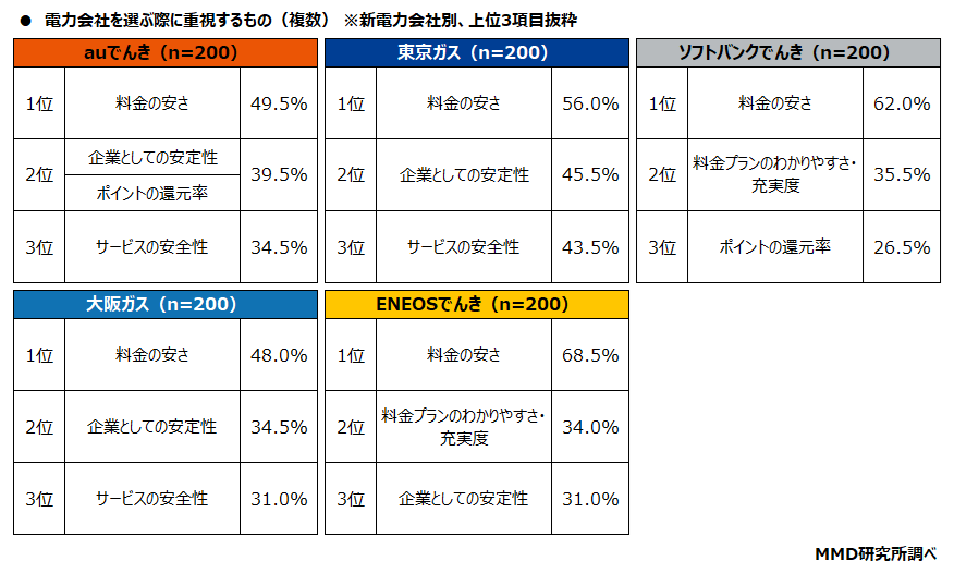また、ユーザーが電力会社を選ぶ際に重視するポイントについては、「料金の安さ」が全社共通でトップとなった一方、auでんきとソフトバンクでんきでは「ポイントの還元率」が2〜3位にランクインするという結果が出ています。通信キャリア系の新電力は、料金の安さだけでなく、ポイント経済圏との相性が選ばれる理由になっていることがわかります。