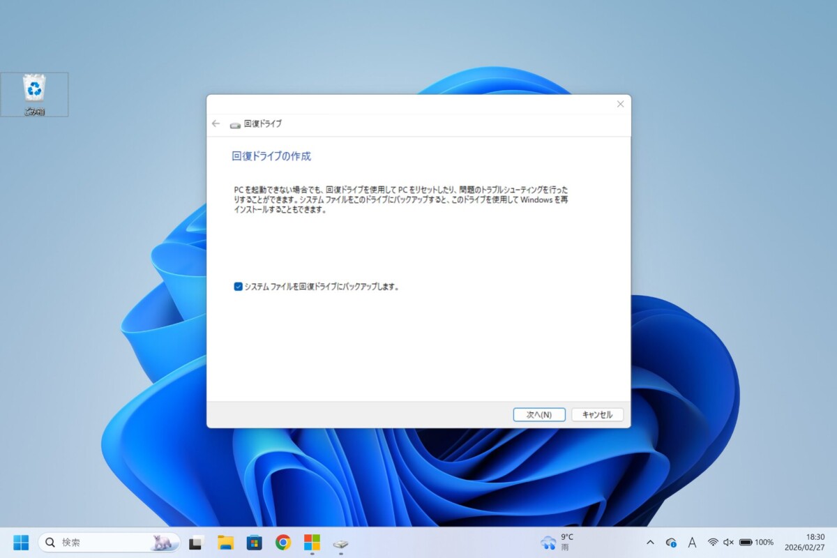 換装にあたり、事前に事前に回復ドライブを作成しておきます。TENKU Note Proの実機でスタートメニューから「回復ドライブ」で検索すればすぐに見つかります。外付けのUSBメモリに作成しましたが、32GBのUSBメモリではだめで、64GBのメモリを使用しました。