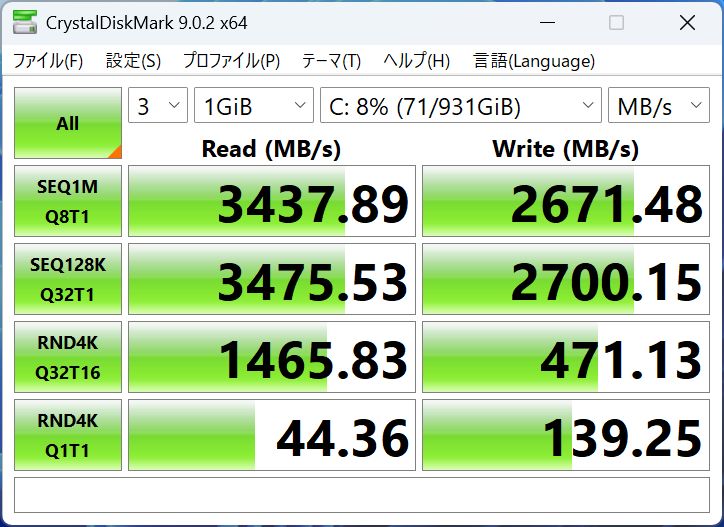 換装後のCrystalDiskMarkの結果は下記。シーケンシャルリードが34000MB/s、ライトが2700MB/sと、換装前よりもだいぶ速くなりました。特にランダムリードが2倍以上速くなっており、アプリの起動なども体感でわかる程度には高速化しています。