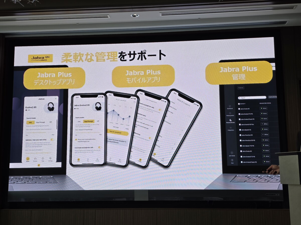 IT管理者向けには「Jabra Plus Management」ソフトウェアを提供。中央ダッシュボードからファームウェアの更新や設定の一元管理が行えます。エンドユーザー向けの「Jabra Plusモバイルアプリ」ではイコライザー調整や風雑音低減設定が可能です。なおJabra Plusのデスクトップ版は2026年後半に提供開始予定です。